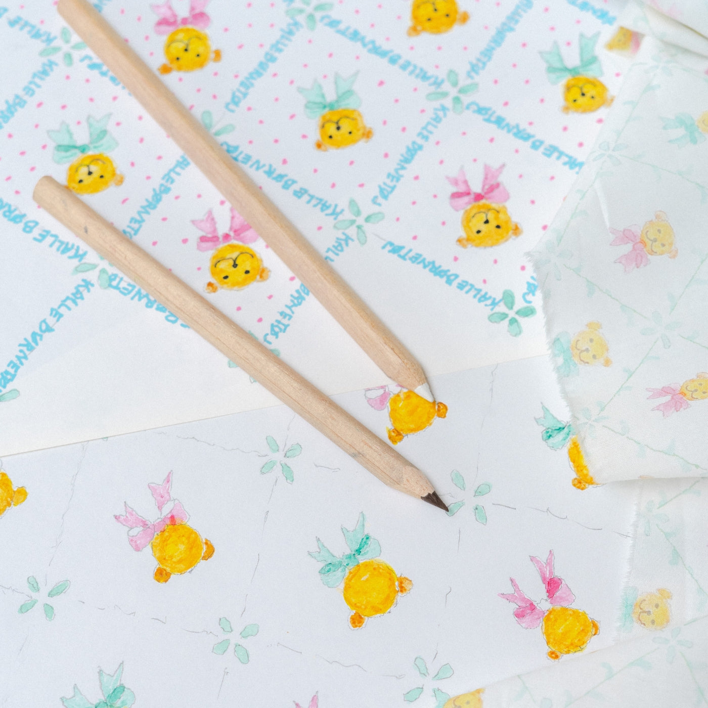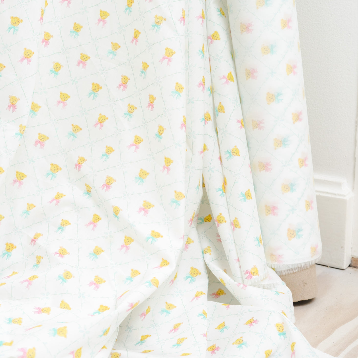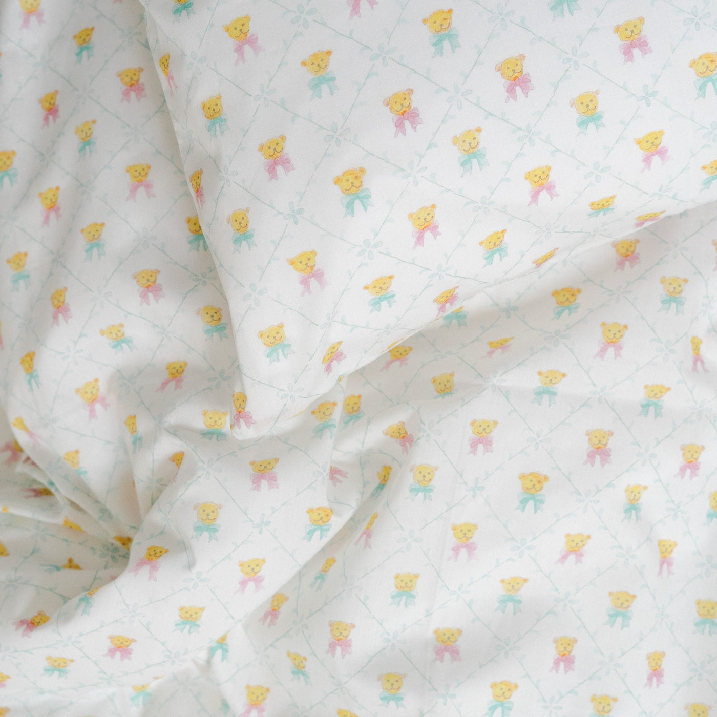 Her møder du små glade bamser med sløjfer, ranker af fine blade og en blid farvepalette, der leder tankerne hen på barndommens ro og leg. Det er et mønster, der er både genkendeligt og unikt – og som kan følge dit barn fra de allerførste år og langt ind i barndommen.
